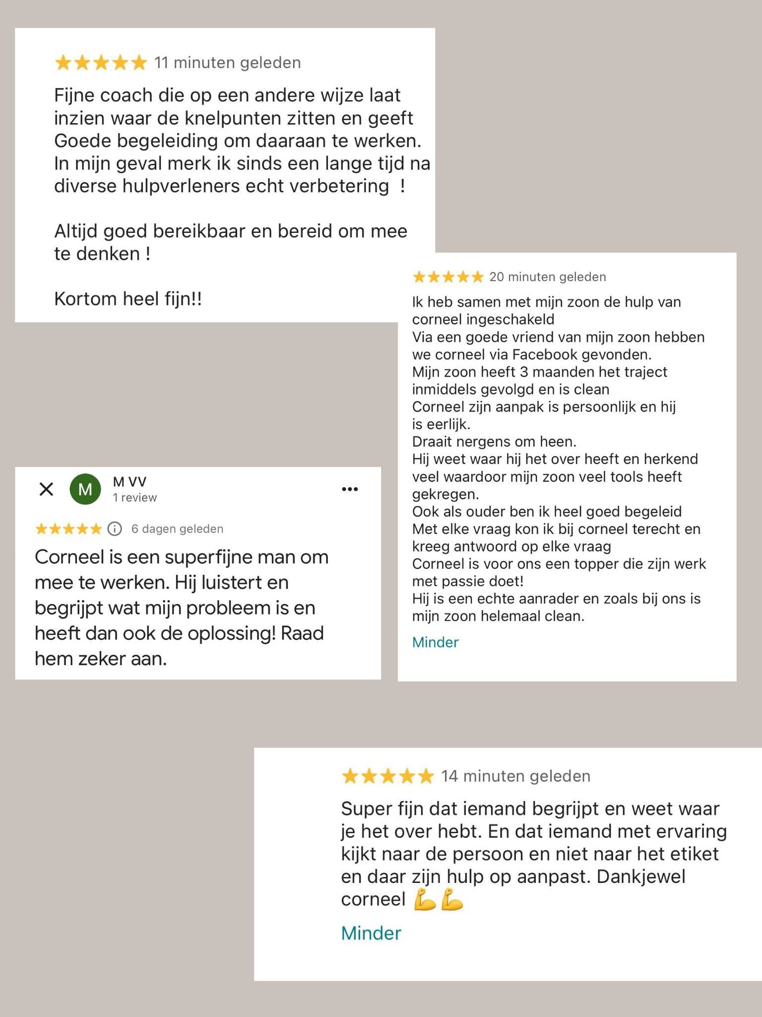 Ik heb de begeleiding van Corneel als prettig ervaren. Het contact met andere hulpverleners verliep stroef maar door de directe en duidelijke aanpak wist ik waar ik aan toe was en stond ik open voor suggesties. Het traject wat Corneel en het contact met Corneel heeft uiteindelijk mijn leven veranderd